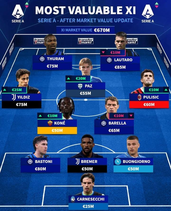 普利希奇(AC米兰)6000万欧元、巴雷拉(国际米兰)6500万欧元、尼科-帕斯(科莫)5500万欧元、夸迪奥-科内(罗马)5000万欧元、凯南-伊尔迪兹(尤文图斯)7500万欧元